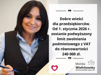 Dobre wieści dla przedsiębiorców. Od 1. stycznia 2026 roku zostanie podwyższony limit zwolnienia podmiotowego […]