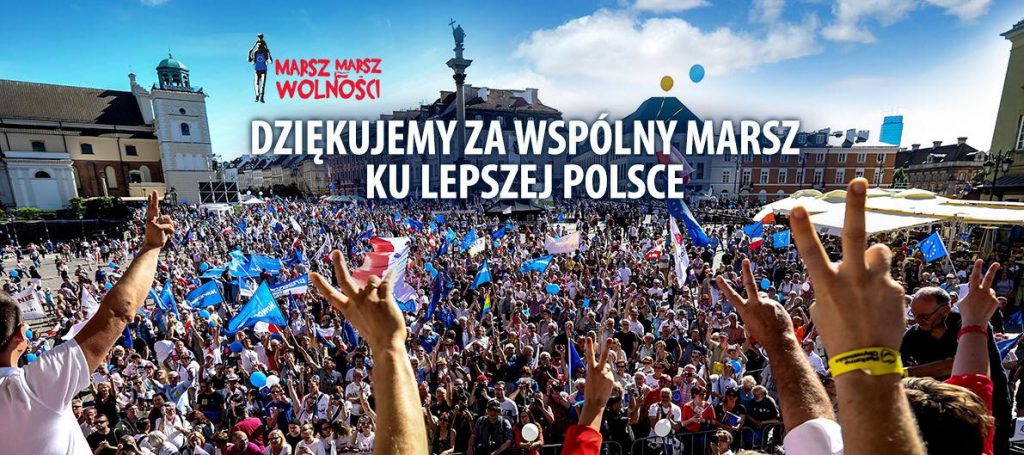 Tysiące Polaków ruszyło w Marszu, zagrzewani do śpiewania i skandowania przez posłankę Monikę Wielichowską oraz posłów Andrzeja Halickiego i Jakuba Rutnickiego szli przez centrum Warszawy. Na trasie marszu pojawiły się inscenizacje nawiązujące do karygodnych i kompromitujących działań PiS. Wśród nich nawiązanie do lotów Anny Marii Anders, słynnej klęski 27 do 1 zaprezentowane jak mecz bokserski i ilustracja więzienia, które szykuje Polkom państwo PiS.
