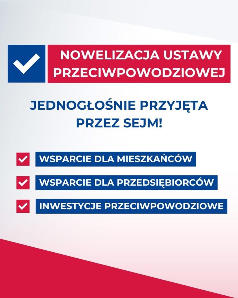 Sejm. Za nami nowelizacja ustawy powodziowej 3.0. Dziś jednogłośnie została przyjęta przez Sejm. Ustawa zawiera szereg kolejnych rozwiązań pomocowych dla samorządów, przedsiębiorców i instytucji. Rozwiązań nad którymi w ostatnich tygodniach pracowaliśmy wspólnie z ministrem Marcinem Kierwińskim, wiceminister Magdaleną Roguską, wiceministrem Michałem Jarosem, samorządowcami, przedsiębiorcami, mieszkańcami i wojewodami.
