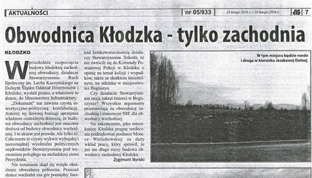 W przeddniu rozpoczęcia budowy kłodzkiej zachodniej obwodnicy działacze Stowarzyszenia „Ruch Społeczny im. Lecha Kaczyńskiego na Dolnym Sląsku Oddział Dzierżoniów i Kłodzko”, wysłali pismo a właściwie to donos do Ministerstwa Infrastruktury.